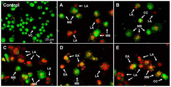 Fluorescent images of acridine orange and propidium iodide (OA/PI)-stained Caco-2 cells after 24 h exposure to (A–B) 3.2 mM and (C–E) 6.4 mM acrylamide. Membrane blebbing (MB), chromatin condensation (CC), early (EA) and late apoptosis (LA), and viable cells (VC). Fluorescence microscopy; 200× magnification.