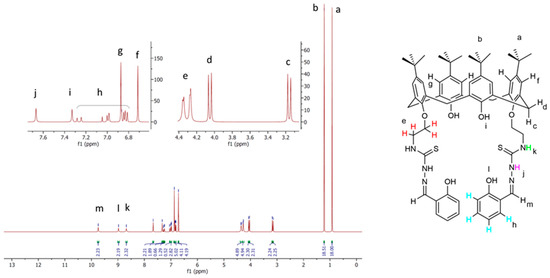 The 1H-NMR spectra of ligand L (Figure 1) show two singlet signals for two sets of 18 t-Bu protons (δ 0.92 and 1.22 ppm), two doublet signals (δ 3.16, 4 protons, and 4.13 ppm 4 protons) assigned to the calixarene -CH2- bridging groups, a multiplet peak (δ 4.36–4.27 ppm) corresponding to the eight OCH2CH2NCS protons, two types of aromatic signals (δ 6.71, 4 protons, and 6.87 ppm, 4 protons) as two singlet signals assigned to the two types of calix[4]arene benzene ring protons, a multiplet peak (δ 6.83, 4 protons) and to two doublets of doublets (δ 6.99 ppm, 2 protons and 7.26 ppm, 2 protons) assigned to four types of aromatic protons of the phenol ring of the thiosemicarbazone arms, a singlet peak attributed to two OH protons of the calix[4]arene lower rim (δ 7.33 ppm), a singlet peak attributed to two thiosemicarbazone NH protons (δ 7.67 ppm), a singlet peak attributed to two NHCS protons (δ 8.68 ppm), a singlet peak attributed to two OH protons of the thiosemicarbazone phenol rings (δ 8.98 ppm), and a singlet peak related to two =CH imine protons (δ 9.74 ppm). The assignments of the 1H-NMR spectrum are in agreement with literature data [48].
