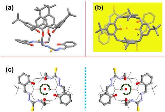 The conformations of the two alkoxythiosemicarbazone substituents on rings B and D are very similar, with comparable values of corresponding torsion angles along the chains. More specifically, the entire conformation of the arms is largely determined by the positive (or negative in the other enantiomeric conformer present in the centrosymmetric crystal structure) gauche conformation of both the ethyl spacer (61.4 and 57.6° for A and C, respectively). As a result, the thiosemicarbazone groups are oriented in opposite directions like a two-blade propeller, reflecting the C2 point group symmetry of the molecule, thereby forming an interesting chiral helicity (Figure 2c).