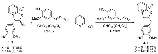 Synthesis of compounds 1–4 based on the reactions of 2-pyridinesulfenyl and 2-pyridineselenenyl chlorides eugenol and isoeugenol.