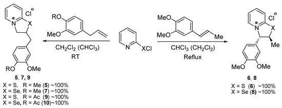 Acetyleugenol was involved in the reactions with 2-pyridinesulfenyl and 2-pyridineselenenyl chlorides. The reactions occurred at room temperature in methylene chloride giving 2-[[4-(acetyloxy)-3-methoxyphenyl]methyl]-2H,3H-[1,3]thiazolo- and -selenazolo[3,2-а]pyridin-4-ium chlorides 9 and 10 (acetyl analogs of products 2 and 4) in quantitative yields (Scheme 2).