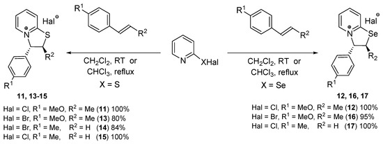 2-Pyridinesulfenyl bromide and 2-pyridineselenenyl bromide were rarely used in organic synthesis and in the preparation of condensed heterocycles [37,38,39]. Usually organylsulfenyl and organylselenenyl bromides are less electrophilic than corresponding organylsulfenyl and organylselenenyl chlorides. On the other hand, the bromine atom is more reactive in the nucleophilic substitution reactions compared to the chlorine atom and can be easily substituted with nitrogen atom of the pyridine ring forming condensed heterocycles.