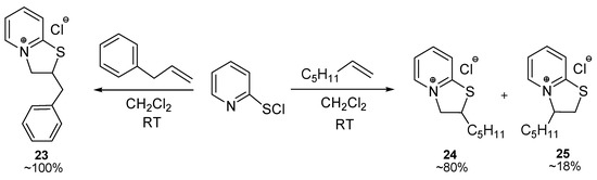 We attempted the reaction of 2-pyridinesulfenyl chloride with one representative of linear 1-alkenes: 1-heptene and observed the formation of two regioisomers 24 and 25 in a 9:2 ratio (Scheme 5). The major product 24 was derived from anti-Markovnikov addition to the double bond. Thus, like 1-alkenes, allylbenzene reacted with 2-pyridinesulfenyl chloride affording heterocycle 23 derived from anti-Markovnikov addition to the double bond (Scheme 5).
