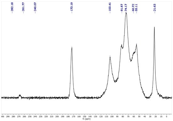 Solid-state CP–MAS 13C NMR of chitin extracted from Vespa velutina. 13C NMR (126 MHz): δ 267.96, 173.17, 104.12, 82.74, 75.34, 60.34, 55.94, 22.79.