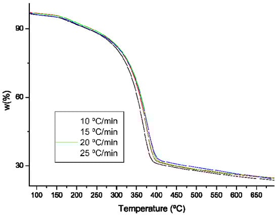 Thermogravimetric analysis is the most commonly used technique for characterizing the decomposition and thermal stability of materials under certain conditions. In addition, kinetic parameters can be extracted from thermogravimetric data and predicted half-life [,]. The main advantage lies in the simplicity and sensitivity of the technique and in the extensive information that was obtained from a thermogram. The experiments were performed at different heating rates (β) between 5 and 25 °C/min. with increments of 10 °C/min., since a priori, with a low heating rate, the evolution of thermal degradation occurs with greater independence of the measurement method, without necessarily being affected by the test.