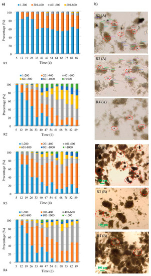 From the 12th day of the study onwards, sedentary ciliates only represented a transient presence in the control reactor, an observation perhaps indicative of a failure to achieve stable operating conditions (for example too low sludge age, too high sludge organic load). In addition, from day 40 onwards, larger quantities of mastigophorans were present, perhaps as a reflection of the low sludge retention time (SRT), or even an overload with organic compounds. In addition, the low SRT in this reactor (3.7 ± 2.7 d) can be confirmed by the absence of testate rhizopods [45]. The reactors supplied with powdered materials did show higher biodiversity to the composition of biomass. A large number of creeping ciliates (mainly Aspidisca and Litonotus sp.), sedentary ciliates (mainly Vorticella sp.) and a few mastigophorans were observed, when it came to the protozoa. However, between days 61 and 75, the reactor with PG lacked sedentary ciliates, while testate rhizopods began to make their appearance in the R2, R3 and R4 reactors from day 47 on, their occurrence in turn being associated with an increased sludge retention time, as well as low F/M, good oxygenation and a low concentration of ammonium-nitrogen. In spite of a higher OLR being applied, rotifers were found to develop en masse from day 40 onwards in the R2 reactor and from day 33 in R3 and R4. It is typical to regard their presence as indicative of well functioning biomass. However, this phenomenon, accompanied as it was by periodic growth of nematodes, was not beneficial for biogranulation, given the way breakups of granules were to be observed in the R3 and R4 reactors, inter alia due to “prey” of these microorganisms. Observations indicate that powdered ceramsite ensured higher system stability.