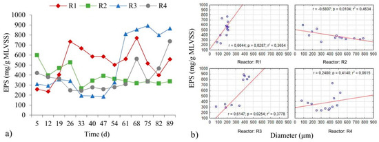 The dependent relationship noted between the EPS value and the diameter of granules in the R2 reactor did achieve statistical significance (p < α, p = 0.0104). The observations from the authors’ own research are comparable with those from Sheng et al. [38], who recorded lower values of EPS in successive days of an experiment in a reactor with larger granules. In turn, in the study by Wei et al. [21], the EPS content in the control reactor and that with powdered activated carbon were at comparable levels, while in the work presented here, it was possible to observe significant differences between the reactors. The different EPS content in the reactors could be due to the presence of powdered materials characterised by a different chemical composition as well as the progressing biogranulation process.