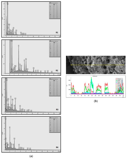 Efforts to identify the elements included in the biomass showed that in the structure of granules, carbon and oxygen were accompanied by calcium, phosphorus, magnesium, sodium, iron, potassium and sulphur. In the granules from the reactors supported by powdered materials, zinc and copper were additionally present. The analysis of the approximate percentage content of elements in the sample (wt%) showed, inter alia, a higher proportion of oxygen and phosphorus in the granules grown in the reactors to which materials had been added. The lowest content of calcium was found in the granules from the R2 reactor and the highest from the R3 reactor. The percentage occurrence by weight of magnesium and iron was comparable in biomass from the R1, R2 and R4 reactors. However, in the granules from the R3 reactor, the Mg content was only around half as high, while the amount of Fe was more than double (Figure 3a).