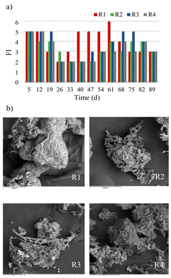 The dehydrogenase activity (DHA) test in relation to biomass evidenced the differences between reactors not fully reflecting the microbiological biodiversity present in sludge. The highest average DHA value (of 71.05 µmol TF/g MLVSS) was recorded in the R1 reactor. For their part, Bernat et al. [46] reported that the dehydrogenase activity of the activated sludge was usually in the range 42–150 µmol TF/g MLVSS, ensuring a COD reduction efficiency of 85–90%. In the other reactors, the DHA values were of 32.01 (R2); 40.51 (R3) and 32.92 µmol TF/g MLVSS (R4). However, insufficient homogenisation of the biomass present most likely had its impact on the results. A correct action to obtain reliable DHA values would involve determination of the optimum trifenyltetrazolinum chloride (TTC) concentration in incubated samples, as well as incubation times for the biomass samples with increased numbers and sizes of granules. Miksch [47] presented this approach as a modification of the TTC test for activated sludge. It should be borne in mind that if TTC concentrations prove to be variable, this reflects the differences in qualitative composition, the structure of activated-sludge flocs and the physiological status of microorganisms.