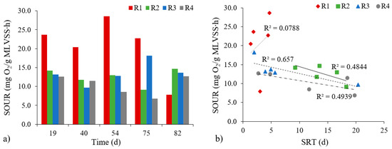 The rate of specific oxygen uptake by biomass in reactors (a) and changes between SOUR values depending on the SRT (b).