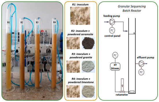Four identical GSBRs with the working volume of 3.0 L (internal diameter of 7.0 cm and effective height of 78.0 cm) were adopted for the research performed on a laboratory scale (Figure 6). The parameters of the experiment were adopted according to the studies of Czarnota et al. [20]. The average daily flow of wastewater through these was of 12.0 L/d at a volumetric exchange ratio equal to 0.5. The amount of wastewater fed during a cycle was 1.5 L, while the hydraulic retention time was 6 h. It should be noted that in R1, it was necessary to control the value of HRT, given the low biomass concentration. The R1 reactor was a control reactor, while others were supplied with the different powdered mineral materials at 3.0 g/L. Thus, powdered ceramsite was added to R2, powdered granite to R3 and powdered limestone to R4 (each material was added once at the reactor inoculation stage). The physicochemical properties of all the powdered mineral materials used are presented in Table 4.
