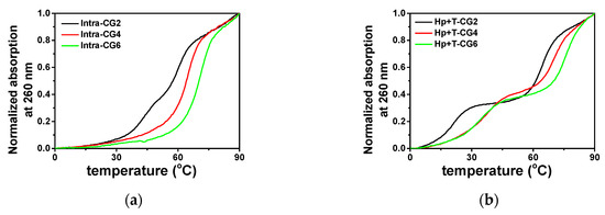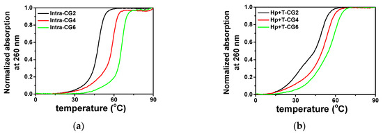 Under the molecular crowding condition of 40 wt% PEG 200, the stability of triplexes was also measured, which is shown in Figure 4. As demonstrated in Figure 4a, in 40 wt% PEG 200, all three of the intramolecular triplexes had only one melting stage, and the Tm values for Intra-CG2, Intra-CG4, and Intra-CG6 were 47.3, 58.0, and 65.3 °C, respectively, which are slightly decreased compared with those in the absence of a crowding agent. These results are consistent with our previous report [9]. On the other hand, the melting curves of intermolecular triplexes did not show two transitions clearly (Figure 4b). Only Hp-CG2+T-CG2 still displayed two stages of melting, which were hard to distinguish. The Tm values for Hp-CG2+T-CG2 of Hoogsteen base pairs and Watson–Crick base pairs in 40 wt% PEG 200 were 31.8 and 49.3 °C, respectively. Comparing with the Tms of Hoogsteen and Watson–Crick in the absence of PEG 200, which were 20.5 and 65.5 °C respectively, the results indicate that Hoogsteen base pairs were stabilized substantially by molecular crowding while Watson-Crick base pairs were destabilized. This corresponds well with the conclusions from our previous work [9]. Both Hp-CG4+T-CG4 and Hp-CG6+T-CG6 shifted to a one stage melting curve, like those of the intramolecular triplexes, showing a single melting temperature of 50.0 and 55.0 °C, respectively. In addition, similar to the results seen in the absence of PEG 200, higher C+*G-C content resulted in a higher triplex melting temperature under molecular crowding conditions. The increment of Tm between Intra-CG4 and Intra-CG6 was 7.3 °C, which were higher than 6.1 °C as seen in the absence of crowding agents. This suggests that the effect of C+*G-C on triplex stability is more obvious under molecular crowding conditions.