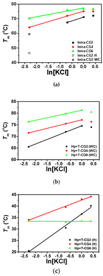 Based on our previous work [6], under molecular crowding conditions, Watson–Crick base pairs were destabilized while Hoogsteen base pairs were stabilized. As a result, both intramolecular and intermolecular triplexes showed only one stage of melting (Figures S4 and S5), except in Hp-CG2+T-CG2 at low KCl concentrations ([KCl] ≤ 0.1 M). Typically, the melting temperatures of intermolecular triplexes are lower than intramolecular triplexes in the presence of potassium. Both intramolecular and intermolecular triplexes showed similar trends in the effects of potassium concentration on triplex stability. As shown in Figure 6a,b, under molecular crowding conditions with low concentrations of KCl from 0 M to 0.1 M, Tms of all triplexes increased with increasing potassium concentrations, except for Hp-CG2+T-CG6. Interestingly, the slopes of intramolecular triplexes Intra-CG2, Intra-CG4, and Intra-CG6, between 0.1 M and 0.5 M K+ concentrations, were 4.60, 2.05, and 0.62, respectively, and the slopes of intermolecular triplexes Hp-CG4+T-CG4 and Hp-CG6+T-CG6 were 0.37 and −0.31, respectively. These results suggest that the stabilization of triplex by K+ was greatly influenced by the C+*G-C content. With increasing KCl concentrations, this increment gradually decreased and did not show a linear relationship between Tm and ln[KCl], as displayed in the absence of crowding agents. At high concentrations of KCl between 1.0 M and 1.5 M, Tms of all triplexes were decreased with increasing potassium concentrations, suggesting an inhibition of triplex formation by K+ under molecular crowding conditions. In addition, ΔTms of intramolecular triplexes (Intra-CG2, Intra-CG4, and Intra-CG6) between 1.0 M and 1.5 M KCl concentrations (ΔTm = Tm(1.5 M) − Tm(1.0 M)) were −0.7, −2.5, and −3.5 °C, respectively, while ΔTms of intermolecular triplexes (Hp-CG2+T-CG2, Hp-CG4+T-CG4, and Hp-CG6+T-CG6) between 1.0 M and 1.5 M KCl concentrations were −2.3, −3.9, and −3.5 °C, respectively. This indicates that the inhibition of potassium was more effective for intermolecular triplexes.