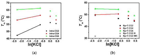 The plot of Tm vs. ln[KCl] of (a) intramolecular triplexes and (b) intermolecular triplexes in the buffer containing 50 mM MES and 40 wt% PEG 200 at pH 6.0. Tm of Hp-CG2+T-CG2 in 0.1 M KCl was separately plotted with Hoogsteen base pairs and Watson–Crick base pairs displayed with open square and + open square, respectively.
