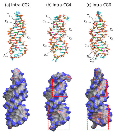 Triplex structures of (a) Intra-CG2, (b) Intra-CG4, and (c) Intra-CG6 obtained via molecular mechanics. All cytosines in the third strand are protonated. Figures in the top panel are triplex structures drawn with a stick model. Red, magenta, orange, green, and cyan sticks in the middle of the structures represent adenine, cytosine, protonated cytosine, guanine, and thymine, respectively. Orange and red sticks at the sides are phosphorus and oxygen atoms, respectively. The bottom panel figures show charge distributions. Blue, gray, and red surfaces show negative, neutral, and positive charges, respectively. The areas with a strong positive charge are highlighted with squares (red dashed line).