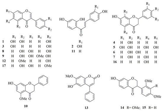 Chemical structures of the seventeen target compounds. 1, 3′-Hydroxydaidein; 2, Butein; 3, Daidzein; 4, Liquiritigenin; 5, Eriodictyol; 6, Butin; 7, Naringenin; 8, Genistein; 9, Tectorigenin; 10, Alpinetin; 11, Isoliquiritigenin; 12, Formononetin; 13, Dalbergin; 14, 3′-O-methylviolanone; 15, Sativanone; 16, Pinocembrin; 17, Prunetin. Analytes numbers in the test is the same as in this figure.