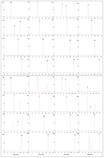 To further evaluate the accuracy of the proposed method, a recovery test was carried out by spiking three levels (80%, 100%, and 120% of the known amount) of mixture standard solution and corresponding IS standards to known amount samples. Next, the spiked samples were extracted and analyzed using the proposed method, and then, triplicate experiments were performed at each level. The recoveries were calculated using the following equation: Recovery (%) = (total amount detected − amount in original sample)/amount spiked × 100%. The recovery for each compound was in the range of 94.18–101.97% and the relative standard deviation was less than 6.0% (Table S1 in Supplementary Materials). The results implied that the developed UHPLC-MS/MS was precise, accurate, sensitive, and reliable enough for simultaneous quantitative analysis of the 17 target compounds in D. odorifera.
