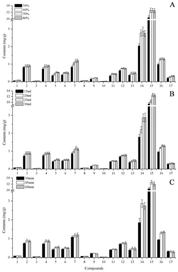 Sample preparation methods are of key importance in the analysis of samples with complex matrices, and especially in the simultaneous analysis of multiple compounds. To develop an efficient and appropriate extraction method for the 17 target components for UHPLC-MS/MS analysis, reflux extraction and ultrasonic extraction were compared used sample S9 (0.2 g). The two extraction methods gave similar results but the ultrasonic extraction was more convenient (Figure S1). Thus, ultrasonic extraction was chosen for subsequent experiments. To optimize the extraction, the extraction solvent (50%, 60%, 70%, or 80% methanol, v/v), extraction volume (15, 20, 25, or 30 mL), and extraction time (30, 45, or 60 min) were investigated. When the methanol concentration was increased from 50–70%, the extraction efficiencies for the analytes increased (Figure 3A). However, when the methanol concentration was increased beyond 70%, the extraction efficiencies showed no large increases. Therefore, we chose 70% methanol as the extraction solvent. There were no obvious differences in the contents of analytes between extraction volumes of 25 and 30 mL (Figure 3B), and the contents of some compounds some compounds (e.g., eriodictyol, naringenin, 3′-O-methylviolanone, sativanone, and pinocembrin) were higher than 20 mL. The best extraction time for all components was 45 min (Figure 3C). Hence, the optimum conditions for extraction of D. odorifera were 0.2 g of dried sample, 25 mL of 70% methanol, and ultrasonic extraction for 45 min.