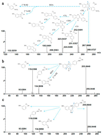 Liquiritigenin gave a precursor ion [M − H]− at m/z 255.0649 (Figure 4b). In the MS/MS spectrum, characteristic ions were observed at m/z 134.9958, 119.0398 and 93.0264, which were consistent with the typical [1,3A − H]− and [1,3B − H]− fragments. Isoliquiritigenin showed similar fragmentation behavior to liquiritigenin (Figure 4c).