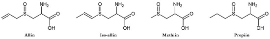 - Starkenmann, C.; Niclass, Y.; Troccaz, M. Nonvolatile S-Alk(en)ylthio-L-cysteine Derivatives in Fresh Onion (Allium cepa L. cultivar). J. Agric. Food Chem. 2011, 59, 9457–9465. [Google Scholar] [CrossRef] [PubMed]