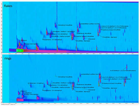 In Figure 2, “contour plots” from HS-SPME-GC×GC-TOF analyses of the onion products are reported—each 2D-peak corresponds to a single volatile compound. In this case, SPME and comprehensive comparative analysis of 2D chromatographic data showed visual differences between samples. The main differences that emerged between the two samples could be summarized as follows—flakes showed higher intensity of sulfides peaks as reported by GC-MS; allylthiol, 2-methyl-butenal and 4,6-diethyl-1,2,3,5-tetrathiolane were detected only in rings sample.