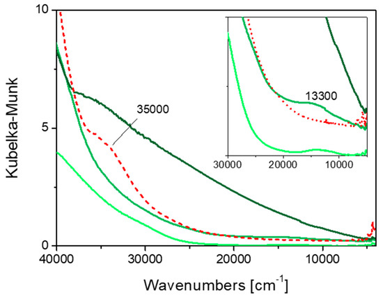 Diffuse reflectance (DR) UV–Vis-NIR spectra were recorded at room temperature on a Varian Cary 5000 spectrophotometer equipped with an integrating sphere attachment (BaSO4 as internal reference), in the 50,000 to 4000 cm−1 range. DRUV–Vis-NIR spectra of the as-prepared samples were reported in the Kubelka-Munk function [f (R∞) = (1 − R∞)2/2R∞; R∞ = reflectance of an “infinitely thick” layer of the sample.