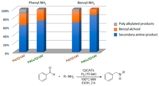 The MW-assisted reductive aminations were performed first at 100 °C on a 0.5 mmol scale adopting a catalyst loading of 5 wt % (referred to the metal content of CβCATs) in the presence of H2 (15 bar) or FA (4 eq); either ethanol or water were exploited as sustainable solvents for this purpose. Using PdCu/CβCAT under H2 pressure, practically good results were obtained for the reductive amination of benzaldehyde with either aniline or benzylamine. In particular, benzylphenyl amine and dibenzylamine were obtained in excellent (73% and 87%) and good (62% and 78%) yields in ethanol and water, respectively, as the only reaction products (Table 1, entries 3 and 9), thus avoiding the direct benzaldehyde hydrogenation over PdCu/CβCAT. Gratifyingly, when reactions were performed under H2 pressure, the PdCu/CβCAT exhibited fairly good activity and selectivity towards the reductive amination of ketones as well (Table 1, entries 6 and 12). Especially, the aliphatic amine afforded up to 80% of N-benzyl-1-phenylethanamine in ethanol, whereas only 49% was achieved in water (Table 1, entry 12). The monometallic catalysts were not so effective; for example, Cu/CβCAT proved to be completely inactive for the reductive amination of both benzaldehyde and acetophenone at 100 °C under H2 either in ethanol or in aqueous solutions (Table 1, entries 1, 4, 7, and 10). Conversely, Pd/CβCAT afforded the secondary amines in good yields only when benzaldehyde was reacted under MW for 2 h, with better results in ethanol for both benzyl phenyl amine (65% vs. 57%) and dibenzylamine (70% vs. 64%) (Table 1, entries 2 and 8). Yet, this catalyst showed no activity in the reductive amination of acetophenone. The influence of the co-metal on the catalyst performance in bimetallic palladium catalysts (the alloying effect) is known [41]. Importantly, the introduction of another metal (Cu) into the intrinsically active Pd/CβCAT led to a catalyst of fine-tuned activity, improving the selectivity of the reaction [26]. In contrast, benzyl alcohol, polyalkylated compounds were detected as main by-products when using the monometallic Pd nanocatalyst (Figure 3).