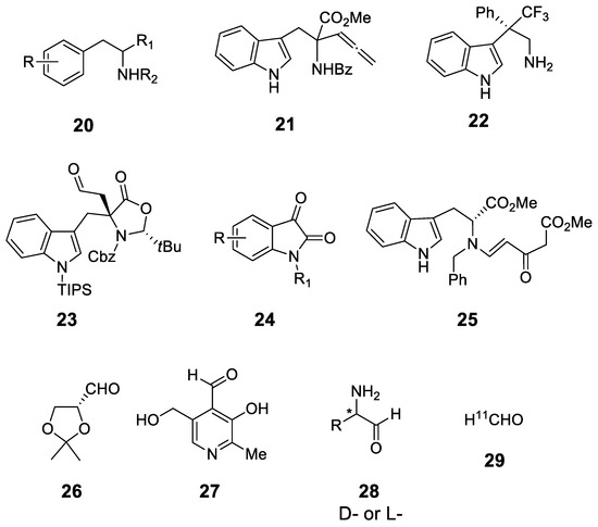 - Bertozzi, C.R.; Agarwal, P.; Sletten, M. Pictet-Spengler Ligation for Protein Chemical Modification. Patent WO 2014078733 A1, 22 May 2014. [Google Scholar]