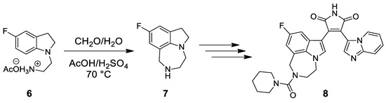 - Magnus, N.A.; Ley, C.P.; Pollock, P.M.; Wepsiec, J.P. Pictet-Spengler based synthesis of a bisarylmaleimide Glicogen Synthase Kinase 3 inhibitor. Org. Lett. 2010, 12, 3700–3703. [Google Scholar] [CrossRef] [PubMed]