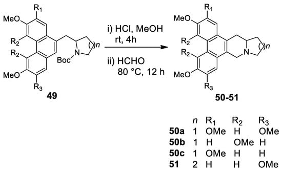 | (±)-lycorane | Figure 3 | CH2O/HCl | Amaryllidaceae family | [87] |