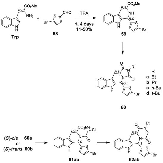 - Schmidt, G.; Waldmann, H.; Henke, H.; Burkard, M. Asymmetric Control in the Pictet-Spengler Reaction by means of N-protected Amino Acids as Chiral Auxiliary Groups. Chem. Eur. J. 1996, 2, 1566–1571. [Google Scholar] [CrossRef]