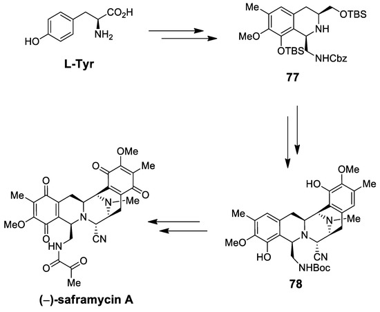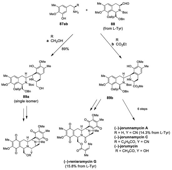 | (−)-jorunnamycins A, C (−)-jorumycin | Scheme 26 | Compound 89 CF3CH2OH, AcOH | renieramycin type | [97] |