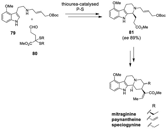 | mitragynine, paynantheine, speciogynine | Scheme 22 | Aldehyde 80 Thiourea-derived catalysts | Mitragyna yohimbinoid alkaloids | [89] |