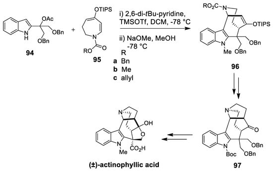 | (±)-actinophyllic acid | Scheme 27 | Different form of P-S | indolohydroazocine | [102] |