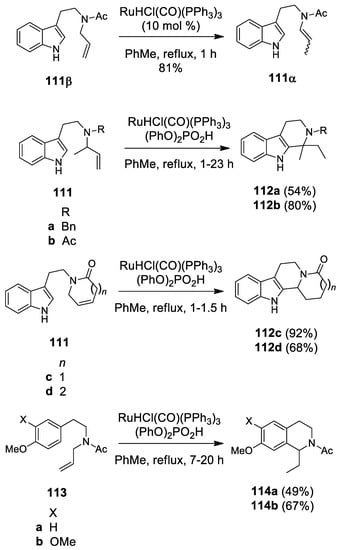 - Ascic, E.; Hansen, C.L.; Le Quement, S.T.; Nielsen, T.E. Synthesis of tetrahydro-β-carboline via isomerization of N-allyltryptamines: A metal-catalyzed variation on the Pictet-Spengler theme. Chem. Commun. 2012, 48, 3345–3347. [Google Scholar] [CrossRef] [PubMed][Green Version]