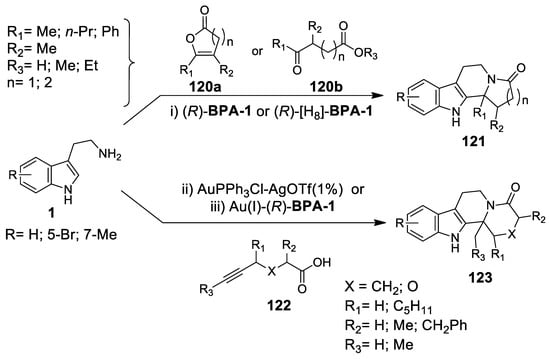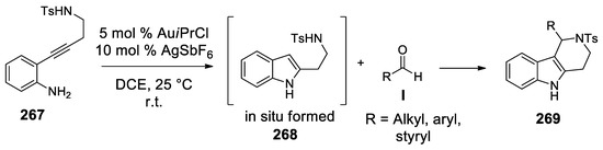 - Subba Reddy, B.V.; Swain, M.; Madhusudana Reddy, S.; Yadar, J.S.; Sridhart, B. Gold-catalyzed domino cycloisomerization/Pictet-Spengler reaction of 2-(4-aminobut-1-yn-1-yl)anilines with aldehydes: Synthesis of tetrahydropyrido[4,3-b]indole scaffolds. J. Org. Chem. 2012, 14, 2610–2613. [Google Scholar] [CrossRef]