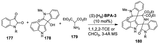 - Duce, S.; Pesciaioli, F.; Gramigna, L.; Bernardi, L.; Mazzanti, A.; Ricci, A.; Bartoli, G.; Bencivenni, G. An easy entry to optically active spiroindolinones: Chiral Brønsted acid-catalysed Pictet-Spengler reactions of isatins. Adv. Synth. Catal. 2011, 353, 860–864. [Google Scholar] [CrossRef]