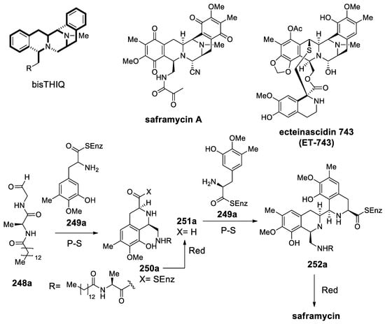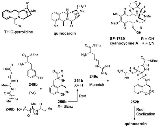 - Hiratsuka, T.; Koketsu, K.; Minami, A.; Kaneko, S.; Yamazaki, C.; Watanabe, K.; Oguri, H.; Oikawa, H. Core assembly mechanism of quinocarcin/SF-1739: Bimodular complex nonribosomal peptide synthetase for sequential Mannich-type reactions. Chem. Biol. 2013, 20, 1523–1535. [Google Scholar] [CrossRef]