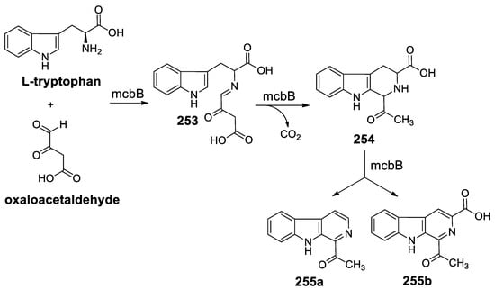 - Chen, Q.; Ji, C.; Song, Y.; Huang, H.; Ma, J.; Tian, X.; Ju, J. Discovery of McbB, an enzyme catalyzing the β-carboline skeleton construction in the marinacarboline biosynthetic pathway. Angew. Chem. Int. Ed. 2013, 52, 9980–9984. [Google Scholar] [CrossRef]