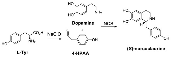- Nishihachijo, M.; Hirai, Y.; Kawano, S.; Nishiyama, A.; Minami, H.; Katayama, T.; Yasohara, Y.; Sato, F.; Kumagai, H. Asymmetric synthesis of tetrahydroisoquinolines by enzymatic Pictet-Spengler reaction. Biosci. Biotechnol. Biochem. 2014, 78, 701–707. [Google Scholar] [CrossRef]