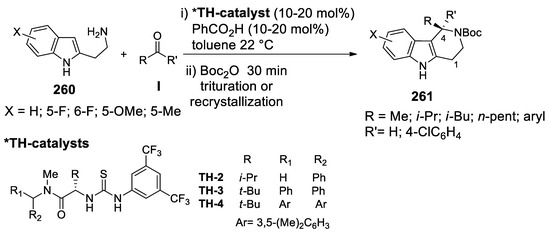 - Klausen, R.S.; Jacobsen, E.N. Weak Brønsted acid-thiourea cocatalysis: Enantioselective iso-Pictet-Spengler reactions. Org. Lett. 2009, 11, 887–890. [Google Scholar] [CrossRef]