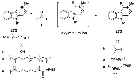 - Agarwal, P.; van der Weijden, J.; Sletten, E.M.; Rabuka, D.; Bertozzi, C.R. A Pictet-Spengler ligation for protein chemical modification. Proc. Natl. Acad. Sci. USA 2013, 110, 46–51. [Google Scholar] [CrossRef]