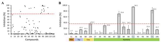 SerB2 is known to catalyze the hydrolysis O-phospho-L-serine into L-serine. During this reaction, the inorganic phosphate (Pi) that is released into the medium can be photometrically determined using a malachite green-based reagent to evaluate the activity of the enzyme [47,48]. Subsequent enzymatic assays were performed in the presence of 122 different therapeutically intended compounds made available by the NAMEDIC research center to identify new anti-TB agents targeting SerB2 (Figure 1A). The preliminary screening was performed at 100 μM in a pH 7.4 reaction media containing 200 μM O-phospho-L-serine, 5 mM Mg and 5% dimethyl sulfoxide (DMSO). In total, 19 compounds inhibited the phosphatase activity of SerB2 by at least 70% and were considered to be primary hits. Among them were a phenyl thiazolamine derivative, two tryptophane derivatives, two coumarin derivatives and 14 harmine derivatives. The primary hits were further tested against SerB2 at 10 μM in three independent reactions. As depicted in Figure 1B, compounds 88, 91 and 95 (Figure 2) are of particular interest since they showed inhibition percentages at least twice as high as the rest of the hits.