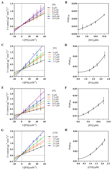 (A,C,E,G) Double reciprocal plots of SerB2 inhibition by compounds 88, 91, 95 and 124 at various fixed micromolar concentrations in presence of 0 to 2 mM O-phospho-L-serine (PS). The data depicted are averaged from two independent experiments ± S.E.; (B,D,F,H) Slope replots of double-reciprocal plots A, C, E and G versus inhibitor concentration ± S.E. on slope calculations. Solid line: fitted Hill-type function (Equation (3)).