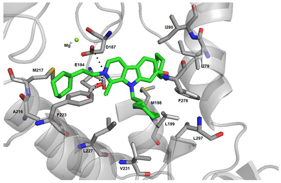 Considering the competitive nature of the inhibition kinetics mechanisms studied above, it is likely that inhibitors interact directly with the active site of the enzyme, disrupting substrate binding. Like other phosphatases, SerB2 possesses an open and a closed conformation in order to let substrates and products of the reaction in and out [55]. This kind of structure possesses highly dynamic properties already shown in similar enzymes [56,57,58]. The SerB2 model generated by homology modeling based on the crystal structure of Mycobacterium avium SerB (Protein Data Bank (PDB) entry 3P96) is in the closed conformation. Rigid docking of ligands as big as harmine derivatives was thus challenging. The Induced Fit Docking protocol was therefore chosen to take the mobility of the closing loop into account. All four inhibitors were successfully docked within the active site of SerB2 (Figure S1) with Glide XP scores ranging from to kcal/mol. The docked structure of the best inhibitor, compound 124, is shown in Figure 4.