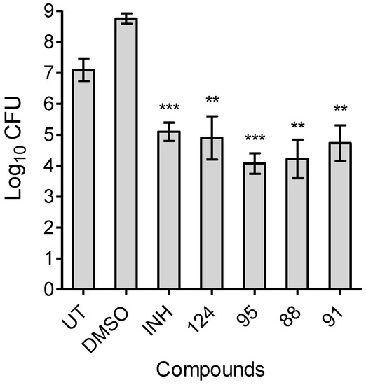 Time-kill kinetics of compounds 88, 91, 95, 124 and isoniazid (INH) against M. tuberculosis H37Rv. Early logarithmic phase cultures of M. tuberculosis were exposed to 10 × minimal inhibitory concentrations (MIC) of the compounds and bacterial enumeration (expressed in colony-forming units (CFU)) was performed by plating 10-fold serial dilutions on MB7H11 plates at day 6 post-exposure. The data shown is mean ± S.E. of data obtained from three experiments performed in duplicates. Statistical significance with respect to DMSO treated samples is reported as ** (p ≤ 0.01) and *** (p ≤ 0.001). UT: untreated.