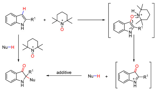 - Deng, Z.-F.; Peng, X.-J.; Huang, P.-P.; Jiang, L.-L.; Ye, D.-N.; Liu, L.-X. A multifunctionalized strategy of indoles to C2-quaternary indolin-3-ones via a TEMPO/Pd-catalyzed cascade process. Org. Biomol. Chem. 2017, 15, 442–448. [Google Scholar] [CrossRef]