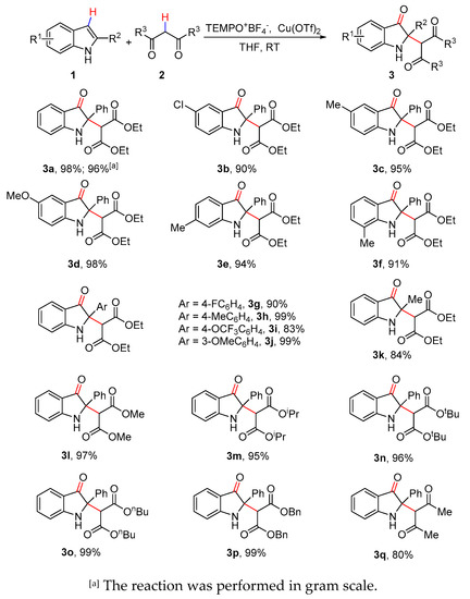 General procedure A: To a solution of 1 (0.1 mmol), 2 (0.2 mmol) and Cu(OTf)2 (0.005 eq.) in THF (1.0 mL) was added TEMPO+BF4− (0.1 mmol) at room temperature. The mixture was further stirred until the disappearance of starting indole by TLC analysis at room temperature. Then, the solvent was removed, and the residue was purified by flash chromatography using acetone-petroleum ether as eluent to afford the desired product.