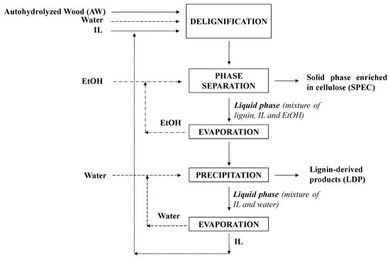 Delignification of autohydrolyzed wood (AW) was carried out using [bmim]HSO4 or [TEA]HSO4 in the presence of water (20% respect to the amounts of IL and solid substrate). Operation was performed in flasks immersed in an oil bath at 160–180 °C using 5:1 liquid to solid mass ratio. 96% ethanol was added to the reaction media (4:3 w/w) to facilitate the separation of the cellulose-enriched solids (SPEC, see Figure 1) by centrifugation (5000 rpm, 15 min). For purification, SPEC were washed three times with 96% ethanol and extracted in Soxhlet for 6 h before determination of yield and composition (using the same methodology as for raw material). The supernatants from centrifugation, the washing liquors, and the liquid phases from Soxhlet extraction were mixed and vacuum-evaporated at 40 °C, leaving an ionic liquid-lignin solution, from which lignin was precipitated by adding water (3 g water/g medium). The precipitated solids (lignin-derived products, LDP) were separated by filtration, washed with water and dried, as shown in Figure 1. Water was removed from the IL phase by evaporation for IL recovery.