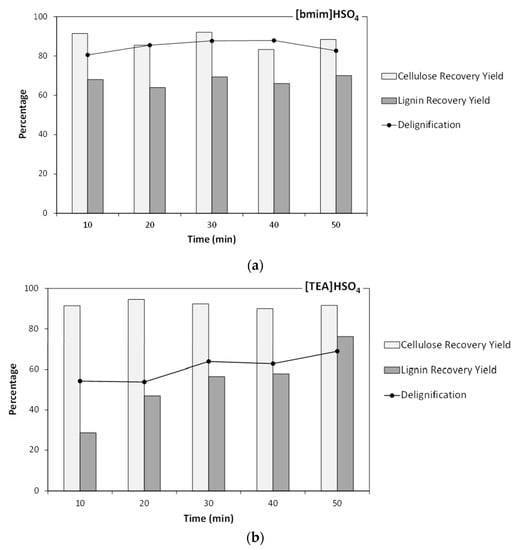 Lower delignification degrees were achieved with the ionic liquid [TEA]HSO4 (see Figure 2b). The maximum delignification percentage was 69% (reached after 50 min), similar to the result reported by Li et al. [28] (69% lignin removal after 3 h). However, this IL enabled high cellulose recoveries, which remained fairly constant (90–95%) along the experimental domain.